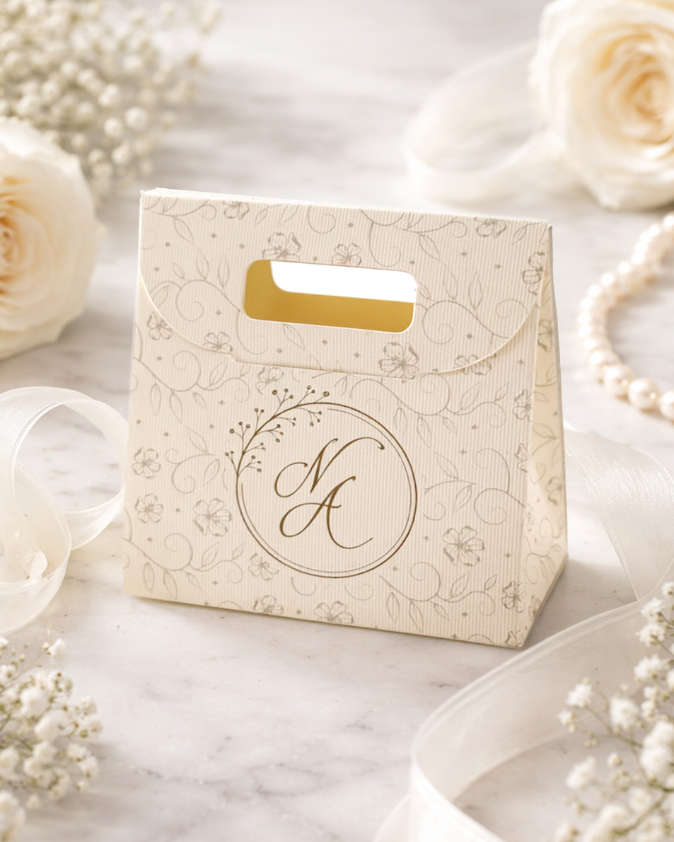 Elegante, luminosa e armoniosa, questa scatolina bomboniera a forma di borsetta è pensata per chi desidera valorizzare ogni dettaglio con gusto e raffinatezza.