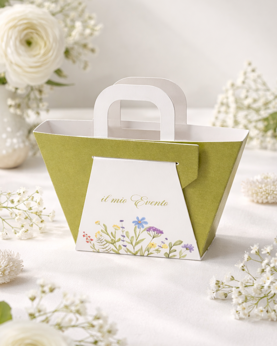 Il design richiama la naturalezza dei fiori di campo, con una palette armoniosa sui toni del verde e del bianco, perfetta per allestimenti raffinati, primaverili e romantici. La pratica maniglia integrata la rende facile da trasportare e ancora più scenografica nella presentazione dei cadeaux per gli ospiti.