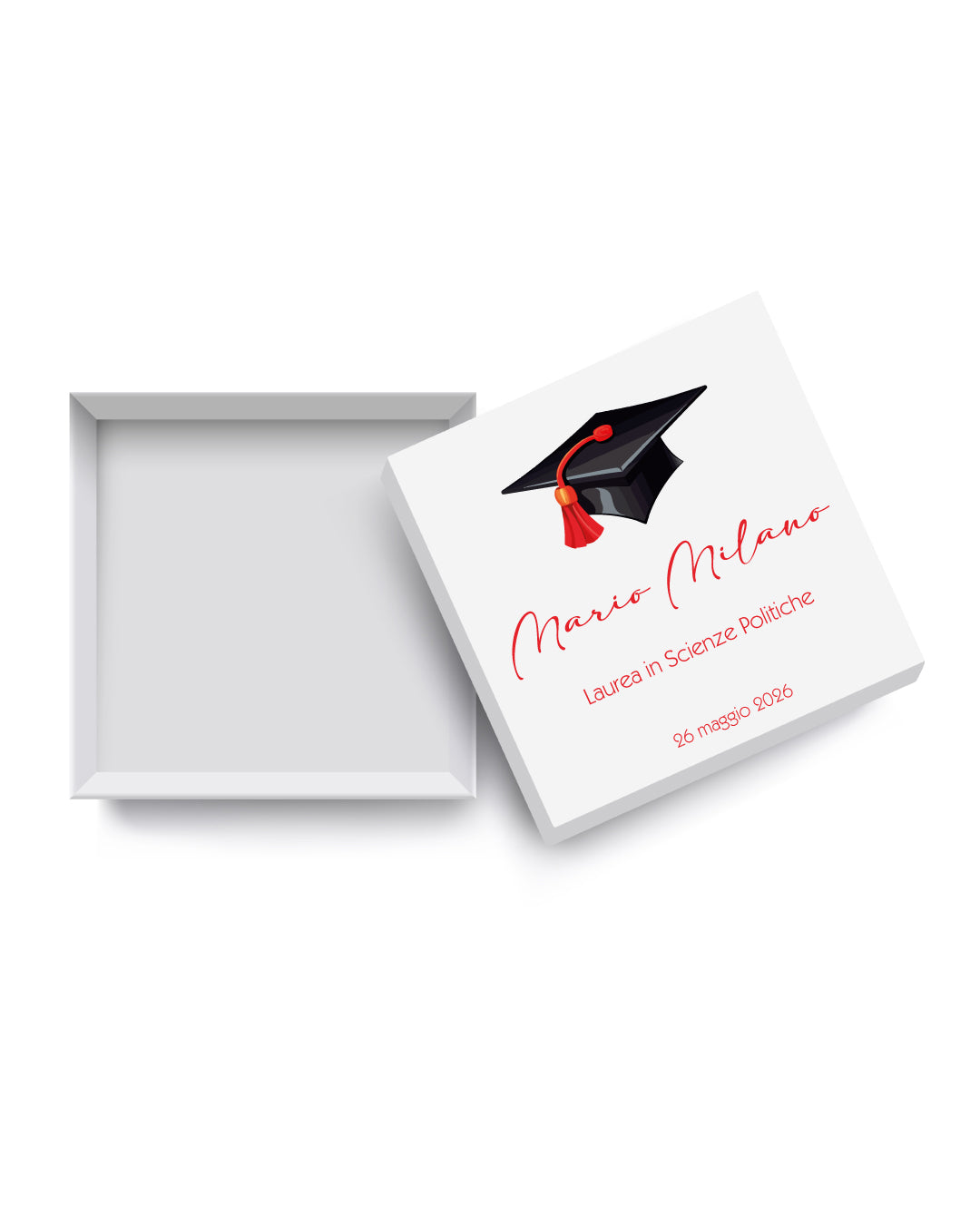 Ogni scatolina può essere personalizzata con una frase speciale come “Laurea in Scienze Politiche”, il nome e la data dell’evento, trasformandola in un ricordo elegante e indimenticabile.